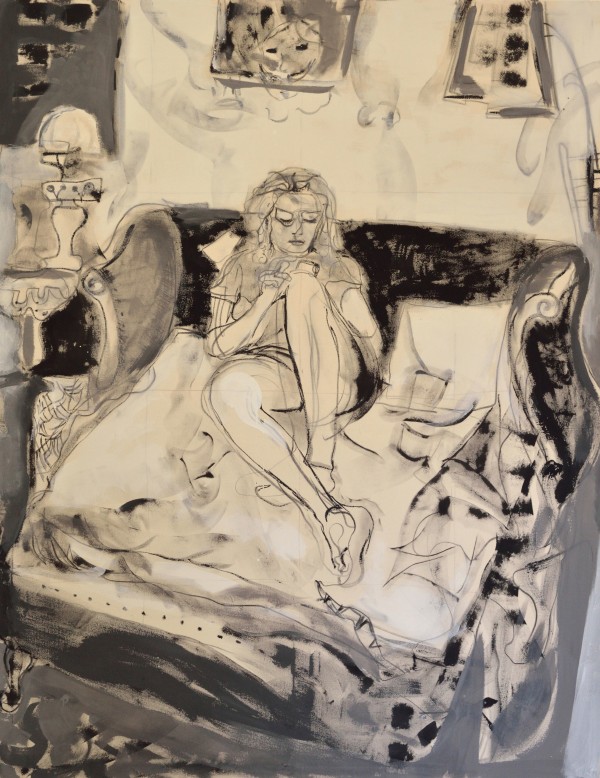 Nebojša Despotovi?, nato a Belgrado nel 1982, dice in un’autopresentazione alcune cose illuminanti sul proprio lavoro, in particolare sul grande polittico realizzato apposta per questo spazio, in realtà un’unica ininterrotta immagine di pittura sciolta, dal gesto libero e veloce, in bianco e nero, che – come dice lui – cerca di creare un “contesto immersivo”, qualcosa che va oltre l’impostazione degli altri 14 quadri esposti. Immersivo per le figure che sono i soggetti principali della scena, ma immersivo anche per lo spettatore che percepisce uno spazio dilatato, dove l’interno di una stanza è privato delle scansioni delle pareti e della prospettiva e diventa quasi il continuum di uno spartito.