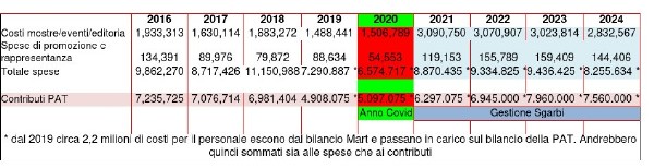 Il punto è che il dato del 2019 è dovuta a un cambiamento nella contabilizzazione delle spese per il personale dipendente, di circa 2,2 milioni di euro, che dai conti del Mart è passata direttamente in capo alla Provincia. In parole semplici: se quei 7 milioni di euro sono stati, bene o male, stabili fino al 2020, dal 2021 in poi – nell’era Sgarbi - la Giunta ha aperto i rubinetti, ha continuamente rimpinguato le casse del museo, ha pareggiato e superato il contributo corrente e contemporaneamente si è accollata il costo del personale in servizio a Rovereto e nelle sedi museali di Trento.