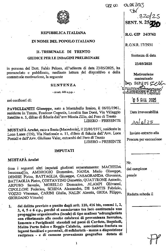 La Suprema Corte non cambiava idea e respingeva il patteggiamento con parole molto nette. Per Mustafà, la nuova qualificazione giuridica, passata da appartenenza ad associazione mafiosa al meno grave favoreggiamento risulta “macroscopicamente errata”, in quanto “le condotte ascritte all'imputato, consistevano in atti intimidatori, compiuti anche con armi, nei confronti di altri imprenditori, finalizzati ad acquisire e gestire attività economiche nel settore del porfido; a sfruttare i lavoratori, creare un clima di intimidazione e paura”. Appunto. In quanto a Paviglianiti la Cassazione ricorda che il capo di imputazione (redatto, ricordiamolo, dalla stessa Procura) gli contestava di avere preso parte all'associazione mafiosa, "riconoscendo e rispettando le gerarchie e le regole interne del sodalizio, eseguendo le direttive del capo cosca, fornendo supporto agli affiliati. Ricopriva la carica di presidente dell'associazione Magna Grecia a Trento ove organizzava incontri e riunioni tra i sodali. Si faceva promotore per fornire assistenza agli appartenenti dei cosche ‘ndranghetiste di Bagaladi (famiglia Paviglianiti) destinatari di provvedimenti restrittivi, organizzando raccolte fondi e un incontro con gli altri sodali”. Insomma, la riqualificazione giuridica, da appartenenza all’associazione mafiosa a mero sostegno, “è palesemente eccentrica rispetto alle condotte descritte nel capo di imputazione”.