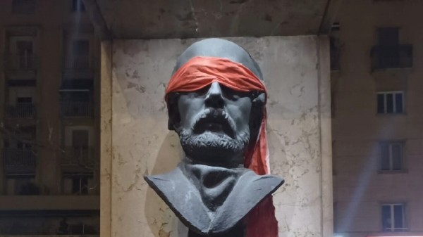 In piazza Mazzini come tutti i martedì si teneva il mercatino dei contadini. In piazza Madonna, davanti alla scuola Goethe (quella della separazione linguistica), i genitori accompagnavano a scuola i bambini e le bambine. Sul ponte Talvera, di fronte alla gelateria chiusa da tempo per l’incapacità gestionale del Comune, la fontanella gorgogliava. Alzando gli occhi tutti si sono trovati davanti a quelle che sembravano installazioni di arte contemporanea: le statue ai piedi della colonna della Madonna, il busto di Giuseppe Mazzini e le figure sulla fontana erano bendati con foulard rossi. Le statue tenevano in mano cartelli dipinti a strisce colorate, le Climate Stripes, che visualizzano i cambiamenti della temperatura sulla Terra degli ultimi 100 anni. E la scritta “Agire ora, Jetzt andeln”. Una protesta forte e gentile, per attirare attenzione, come scrive Extinction Rebellion South Tyrol sul suo sito, sui rischi che corre l’umanità: “Il nostro ambiente di vita è in pericolo! La crisi climatica mostra già danni gravi. Chiediamo alla Giunta provinciale del Sudtirolo di adottare finalmente misure concrete per la difesa e il bene della popolazione civile. La bendatura è il simbolo metaforico della cecità della classe dirigente verso il progredire della catastrofe ambientale e climatica”.