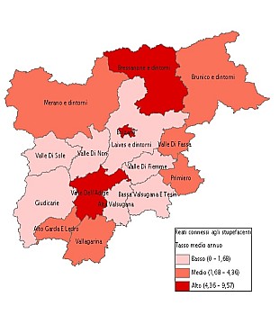 Dal 2004, poi, grazie alla nuova banca dati S.D.I (Sistema di Indagine) del Ministero dell’Interno, è possibile la raccolta di informazioni sul luogo in cui sono commessi i reati denunciati e, quindi, la mappatura dei reati di droga sul territorio regionale. La mappa individua come zone più calde i due capoluoghi, Trento e Bolzano, e il territorio brissinese al confine con l’Austria.