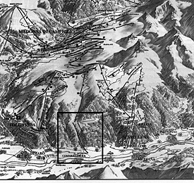 La Val di Sole, il comprensorio sciistico di Folgarida-Marilleva, e il collegamento Daolasa-Val Mastellina. Il disegno evidenzia la pretestuosità delle polemiche: il Pup, per motivi ambientali e di sicurezza, prevede l’arrivo del primo tronco (tratto punteggiato) a quota 1600, da cui partirebbe il secondo (le stazioni sono indicate con il quadratino bianco) per arrivare agli altri impianti. Il progetto degli impiantisti (linea tratteggiata, stazioni con tondino bianco) prevede il cambio di impianto a quota 1400: si dice per avere la pista alta più lunga. Ma la diffeenza è minima, solo settecento metri! E’ possibile fare una guerra per 700 metri di pista? Se si osserva la cartina si scopre l’arcano: quota 1400 è servita dal vicino tornante stradale, e sarebbe ideale per un’espansione edilizia.