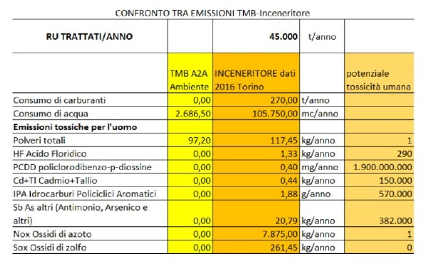 Non basta: sembra doveroso a questo punto effettuare il paragone tra gli effetti tossici provocati dall’inceneritore a quelli del TMB (gli effetti economici li abbiamo già visti: un rinnovato impianto TMB costerebbe 20 milioni, l’inceneritore oltre 200). Ora, esiste numerosa letteratura che confronta le emissioni dei due tipi di impianti. Riportiamo uno degli studi indipendenti, in questo caso quello prodotto da ARPA Piemonte nel 2019. Da esso si ricava la tabella qui sopra, parametrizzata al caso delle nostre 45.000t/a.