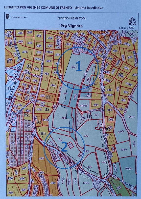 La foto satellitare a fianco è di Google Earth, dell’ottobre 2019. Ritrae l’area di cui parliamo, a Villazzano, sulla collina di Trento. Un’area verde, un polmone, in massima parte classificata “zona agricola di interesse primario” secondo il Piano Regolatore (le particelle colorate in verde chiaro, vedi immagine a pagina 10, mentre sempre zone agricole ma “di interesse secondario” sono quelle in verde più scuro). Zone agricole dunque. Quindi sacre, stando non solo ai discorsi degli esponenti politici, non solo alla sensibilità dei cittadini, ma anche a tutte le premesse degli strumenti urbanistici. Nei quali si sprecano le frasi “sviluppo sostenibile e durevole” e, più nello specifico,“aree agricole di pregio da tutelare ai fini della valorizzazione produttiva e paesaggistica” ecc. Ottimi propositi, ribaditi a ogni pié sospinto, fino allo sfinimento.