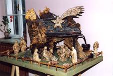 Ciò che ci ha colpiti ancor di più sono stati i presepi. Ogni anno viene allestito un nuovo presepe costruito con legno compensato lavorato con il traforo e le statuine fatte con quel materiale di cui dicevamo prima. Il presepe per il Natale 2000 hanno già cominciato a prepararlo ed hanno già costruito la grotta che è bellissima. Ci hanno fatto vedere il disegno e ci hanno detto che sarà lungo due metri e mezzo.
