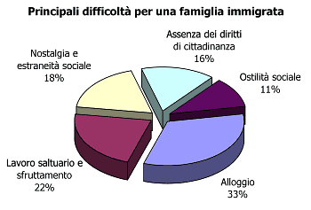 Con queste premesse, è logico che in queste famiglie sia molto diffuso un sentimento di estraneità rispetto alla realtà circostante; un sentimento che tocca in maniera particolare albanesi e maghrebini e che non è solo, come si potrebbe pensare, una questione di tempo, altrimenti non si spiegherebbe perché le comunità di più recente insediamento (europei dell’est, tranne gli albanesi) sono quelle che si sentono meglio integrate e più soddisfatte. C’entra anche la lingua, il livello culturale, le tradizioni, ecc. "Sussistono certo fattori concreti - leggiamo nella ricerca - che contribuiscono ad attenuare o rafforzare il sentimento di estraneità. La vicinanza al paese d’origine, l’opportunità di potervi fare visita spesso, come accade ai cittadini dell’Est Europa. Ma anche la rappresentazione sociale e gli effetti dell’informazione mediatica sull’immaginazione collettiva, che oggi in particolare, tendono frequentemente a veicolare stereotipi e generalizzazioni culturali"; elementi, questi ultimi, che non a caso toccano in modo particolare proprio le etnie che si dichiarano più a disagio: nordafricani e albanesi. A conferma di ciò, si è anche notato che "fra i cittadini di origine albanese è stata rilevata da parte degli intervistatori (di madrelingua) una più accentuata diffidenza rispetto alla ricerca e alle relative finalità".